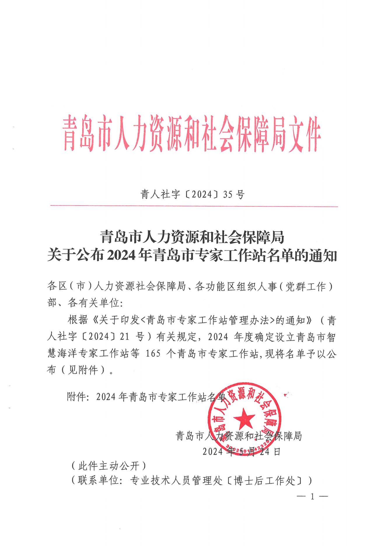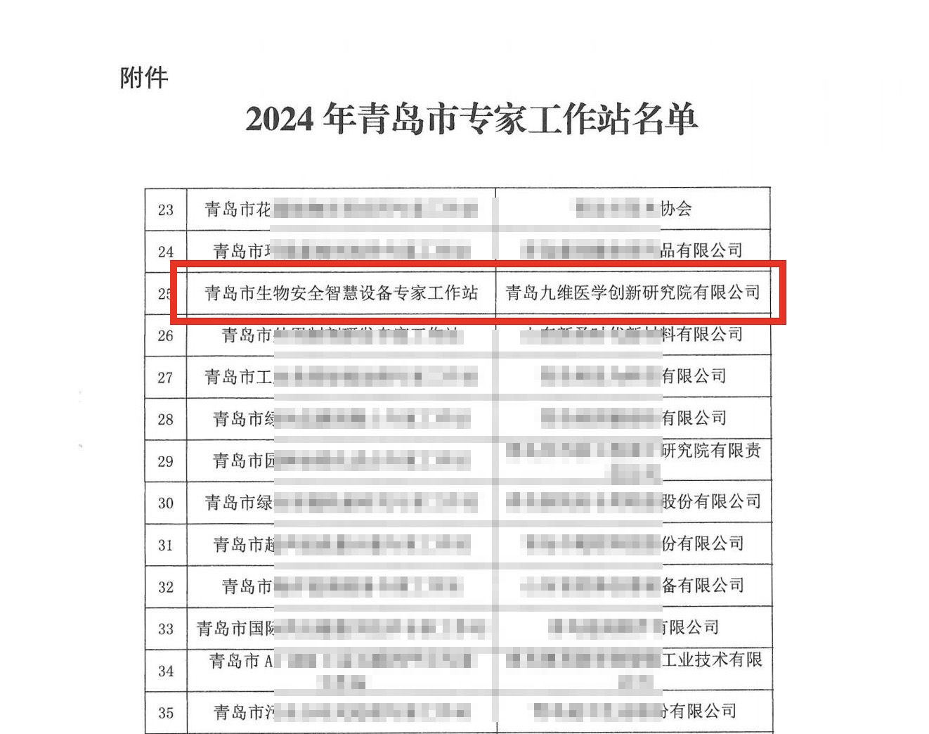 近日,青岛市人力资源和社会保障局公布了2024年青岛市专家工作站认定单位名单,青岛九维医学创新研究院有限公司成功入选。